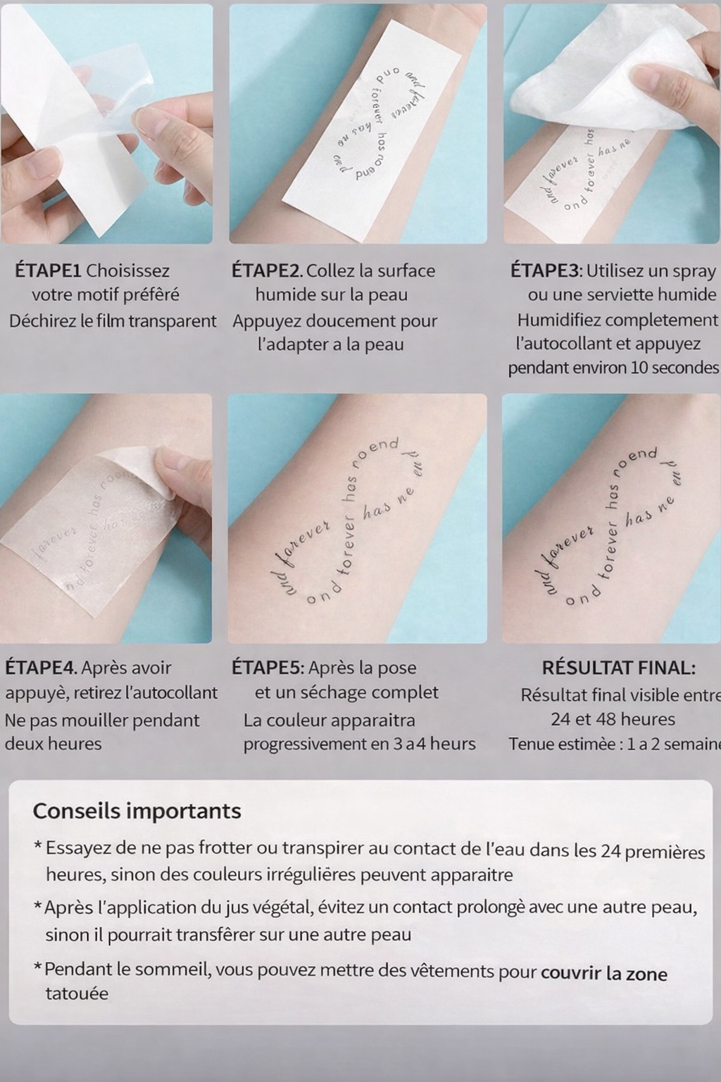 tatouages éphémères longue durée, offrant une tenue de 1 à 2 semaines....